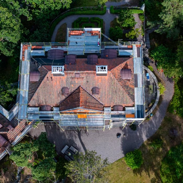 Villan har fått ett helt nytt tak som ger både skönhet och funktionalitet. Det gamla, slitna tegeltaket revs, och under rivningen upptäcktes skador på takstolar och underliggande träkonstruktioner, orsakade av fukt och läckage över tid.